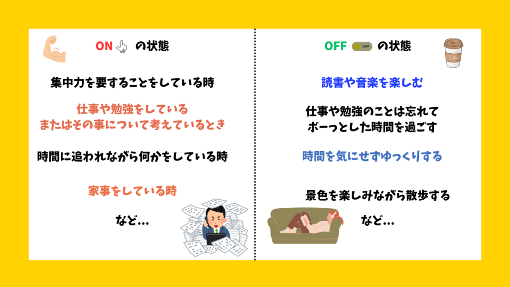 ON と OFF をはっきりすると言う言葉は皆さんもよく耳にしてきたのではないでしょうか。